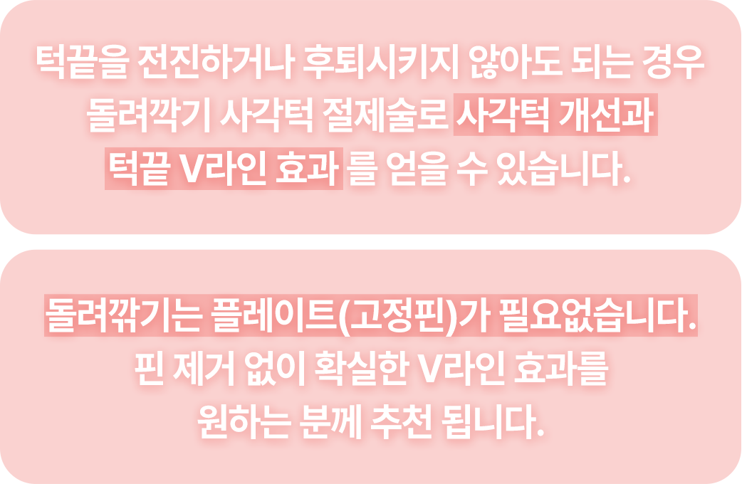 ※주걱턱, 무턱이 있는 경우 T절골 턱끝성형이 함께 시행되어야 합니다.